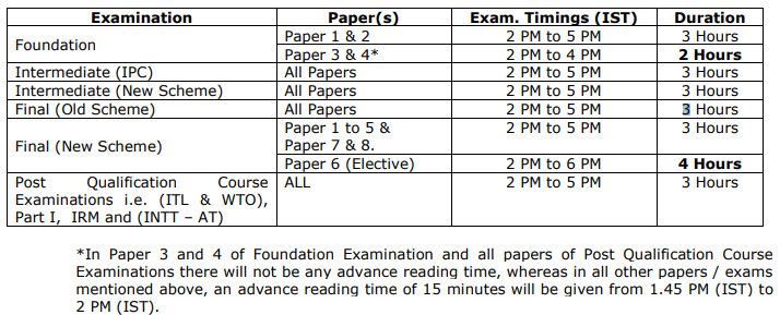 Candidates are also informed that two of papers 3& 4 of the Foundation Exam are of 2 hours. Similarly, Elective Paper – 6 of the Final Examination (under the New Scheme) is of 4 hours. Whereas all other examinations are of 3 hours duration. The same is shown below
